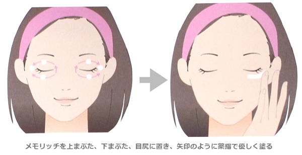 目の周りにつける時は、米粒1粒分を上まぶた中央、目尻、下まぶた中央の3点に分けてつけ、上は目頭から上まぶたを通って目尻に向け、下は目頭から下まぶたを通って目尻へと、中央から外側へとリンパの流れに則して薬指でかるーく半円を描くように塗り広げます。